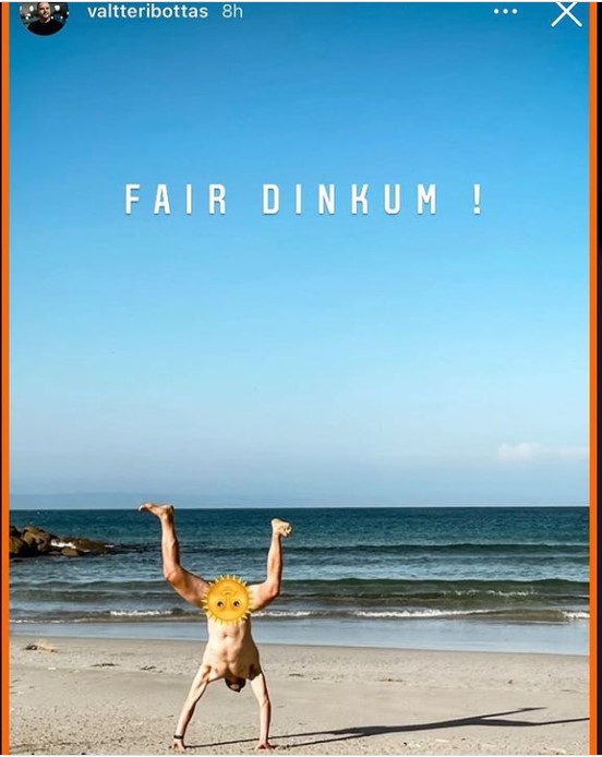 Il risultato finale è che si vede Valtteri completamente nudo in spiaggia mentre si sta esercitando in una sorta di capriola e per non avere problemi con Instagram ha deciso di coprire i suoi gioielli di famiglia più preziosi con la faccina di un sole sorridente.