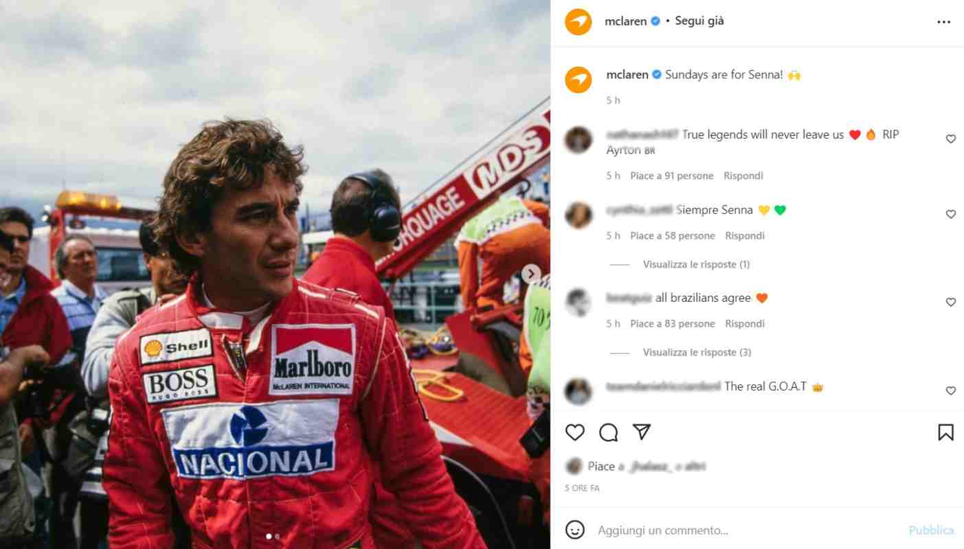 Il team di Woking è ancora legatissimo a quel campione, che aveva reso grande il team all’epoca comandato da Ron Dennis. In un post pubblicato sui profili social, la McLaren ha caricato due foto di Ayrton con la classica tuta rossa e la didascalia: “Sundays are for Senna!“, un modo per dire che le domeniche sono dedicate a lui.