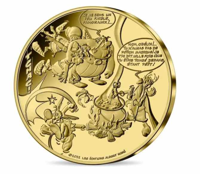 Davvero molto spiritoso e simpatica anche la moneta della quale viene raffigurato un dialogo tra Obelix e il druido Panoramix, probabilmente dove quest’ultimo spiega alle grande eroe che non può bere la famosa pozione magica.